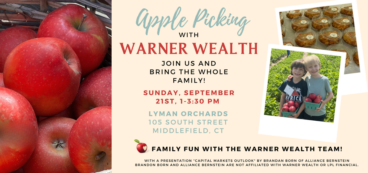 This event is sure to be a fun-filled day with the Warner Wealth team---complete with apple picking, fresh cider, sweet treats, and plenty of family fun. We can't wait to see you there!